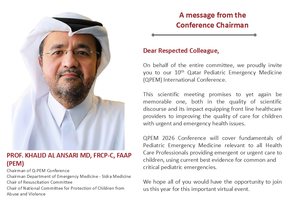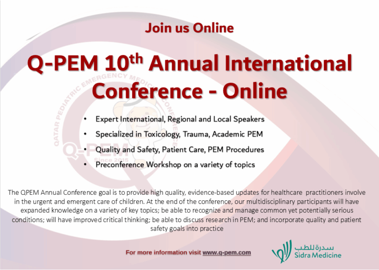 The 10th Qatar - Pediatric Emergency Medicine (QPEM) International online conference 2026 is open to the following target audience Physician, Nurse, Pharmacy, Allied Health Professional, Dentists, Others (Paramedics, EMTs, & Medical Students) with an interest in or practice involving providing emergency and urgent care to children.